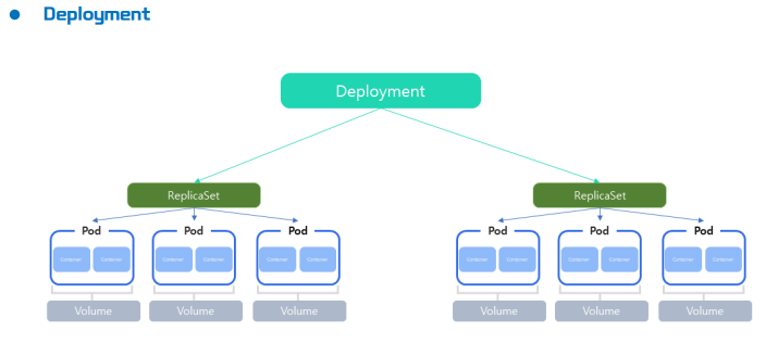 - Deployment는 ReplicaSet의 상위 개념으로, Pod와 ReplicaSet에 대한 배포를 관리하는 역할을 한다.