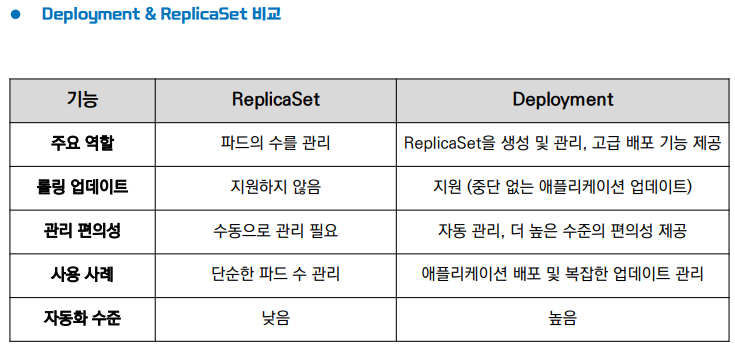 하지만 Deployment는 ReplicaSet을 생성하는 역할을 하기 때문에 아래와 같은 차이들이 존재한다.