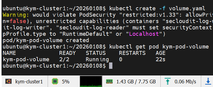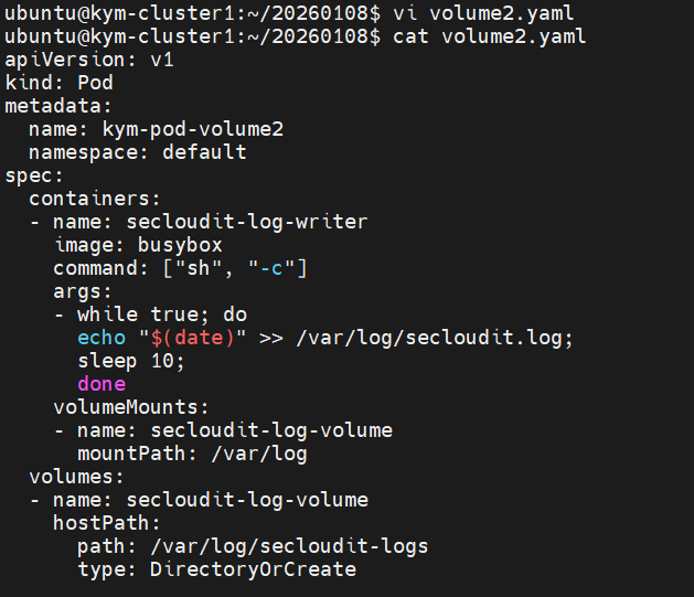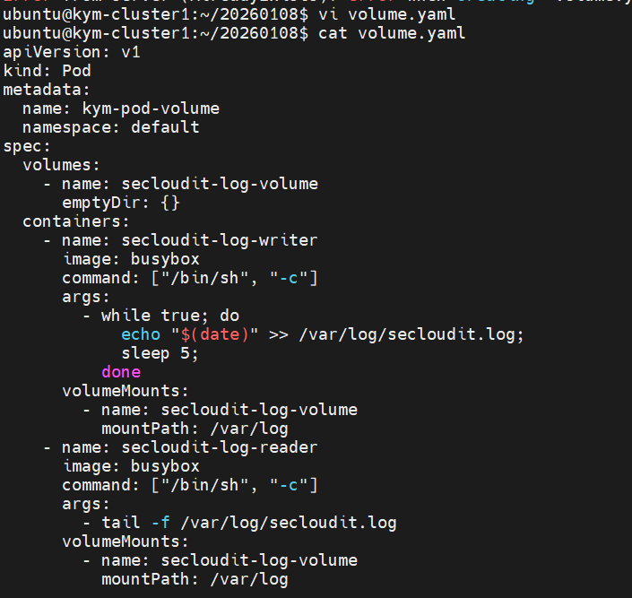 Pod내부에 Container 2개가 서로 Volume을 나눠쓰는 실습