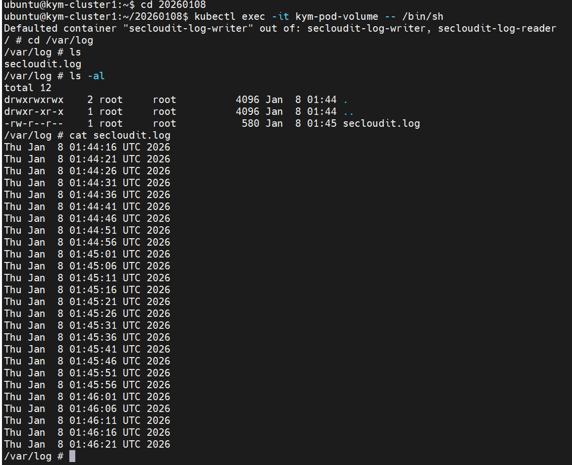 배포된 파드에 들어가서 보면 로그파일이 잘 생성된 모습을 볼 수 있다.
