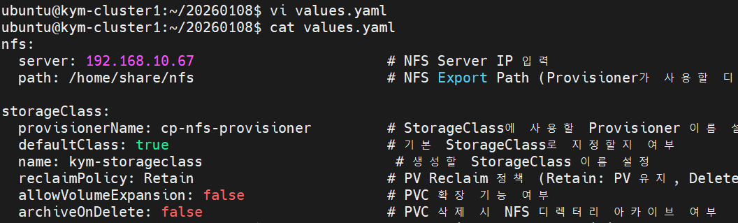 ※ NFS 서버 설정값과 StorageClass 설정 값을 바탕으로 비로비저너를 실제 클러스터에 배포하기
