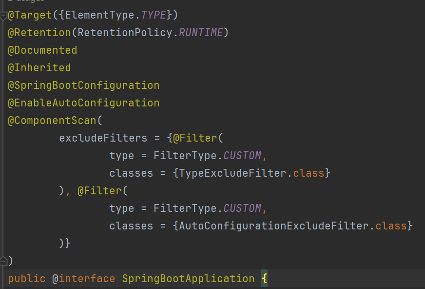 @SpringBootApplication 어노테이션의 구현체를 들어가보면 여러가지 어노테이션들이 붙어있는 것을 볼 수 있다.